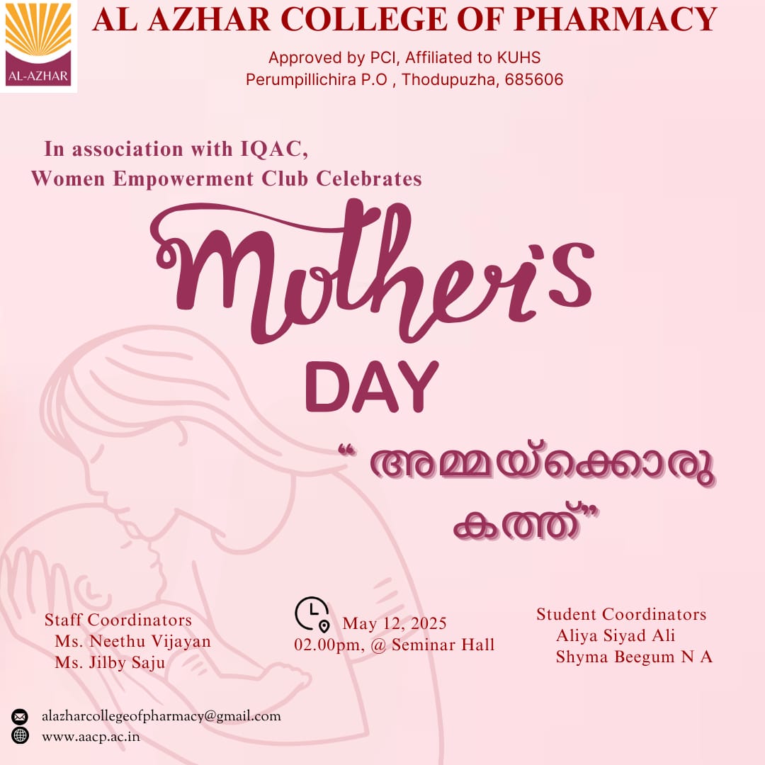 Al Azhar College of Pharmacy, in association with the IQAC and the Women Empowerment Club, celebrated Mother’s Day with great enthusiasm. As part of the celebration, a letter-writing competition titled "Ammakkoru Kathu" (A Letter to Mother) was conducted to encourage students to express their love and gratitude toward their mothers through heartfelt letters.