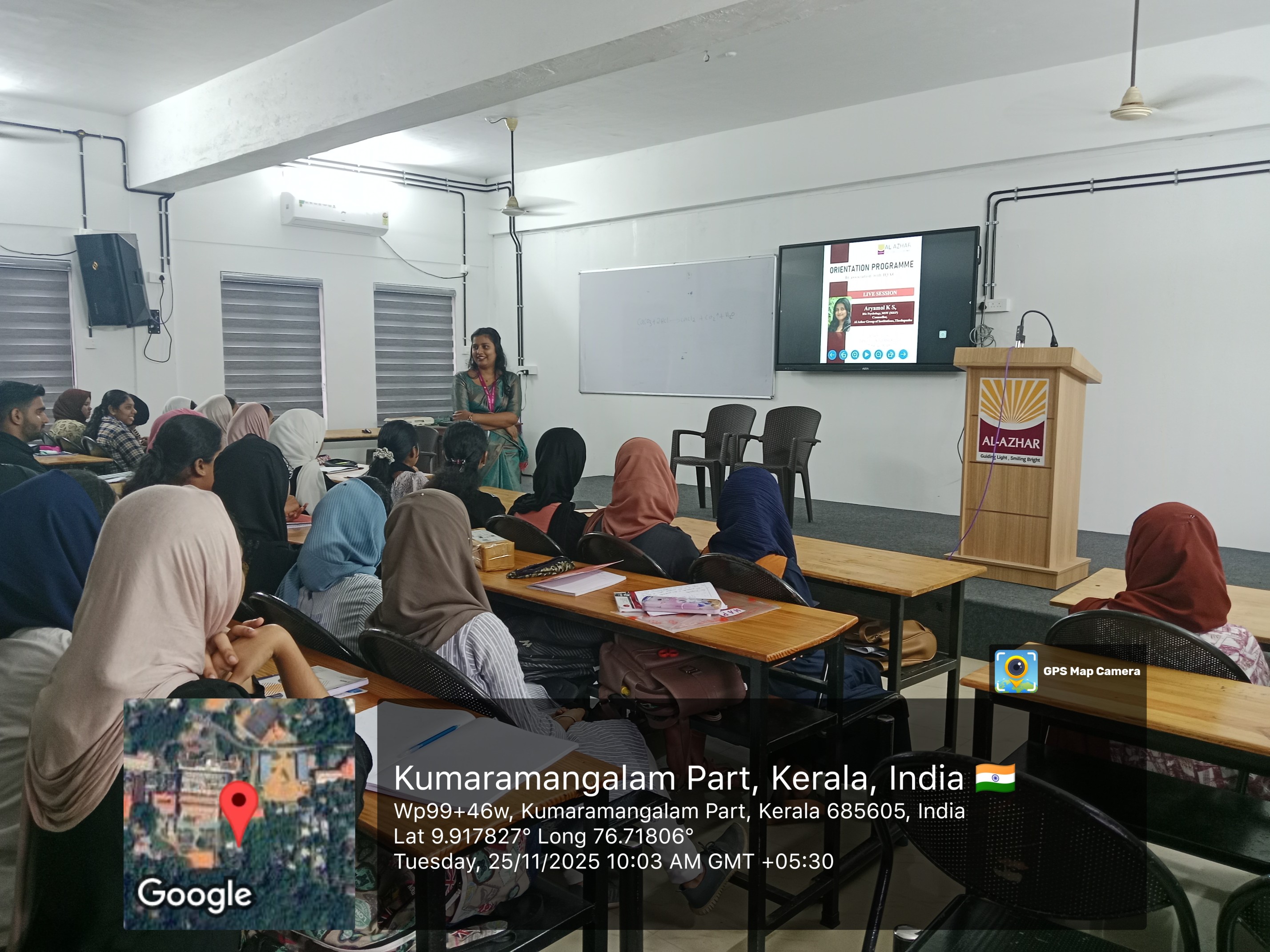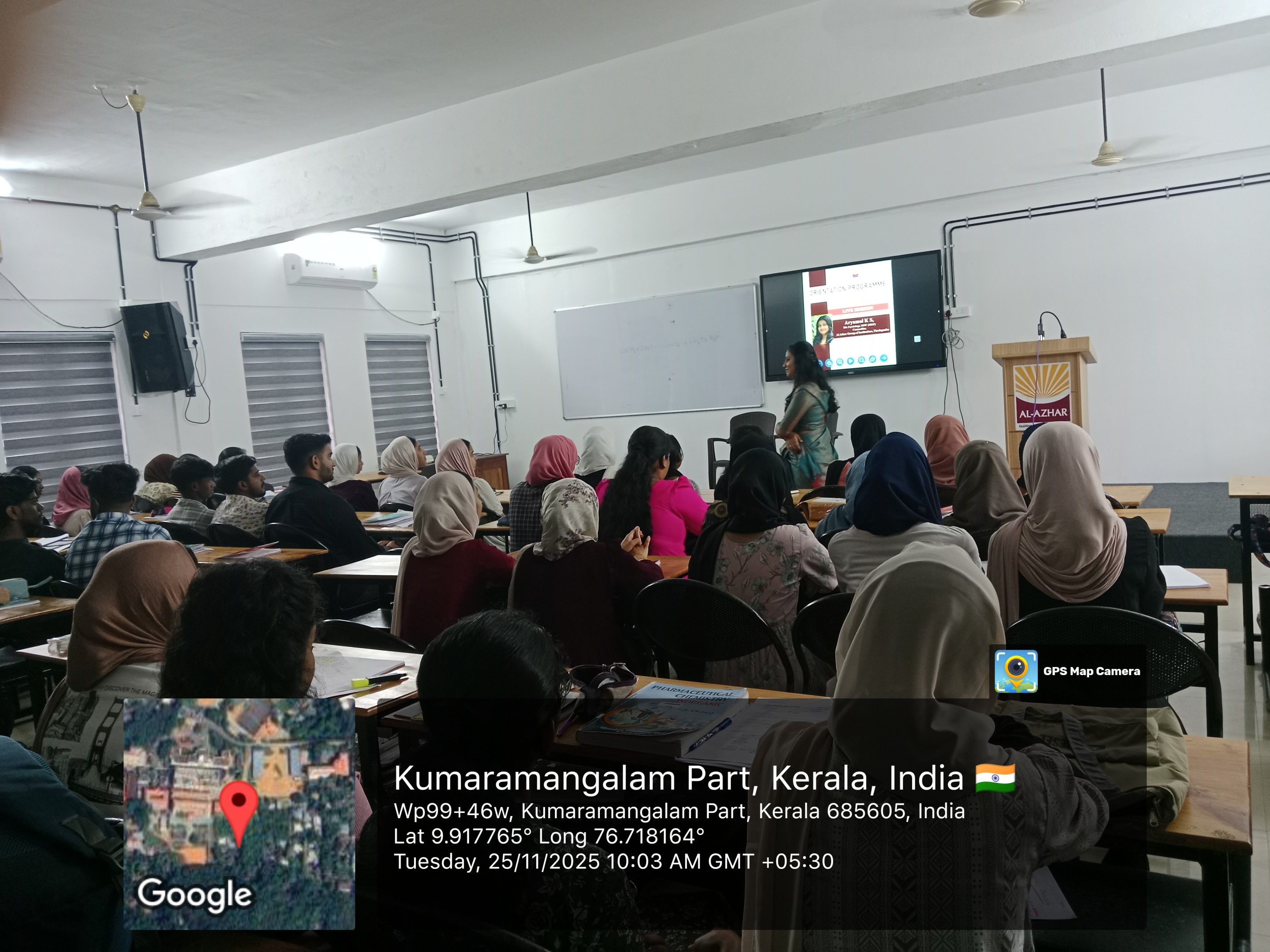 An Orientation Programme on Mental Health was conducted on 25th November 2025 at 10:00 am in the seminar hall of Al Azhar College of Pharmacy for the first semester B. Pharm students, organized by IQAC. The session was led by Ms. Arya Mol K.S, Counsellor from Al Azhar Group of Institutions, who discussed the importance of mental well-being, stress management, emotional balance and seeking timely support.