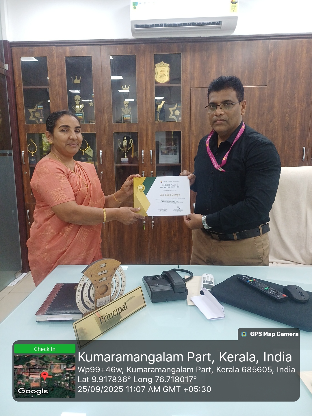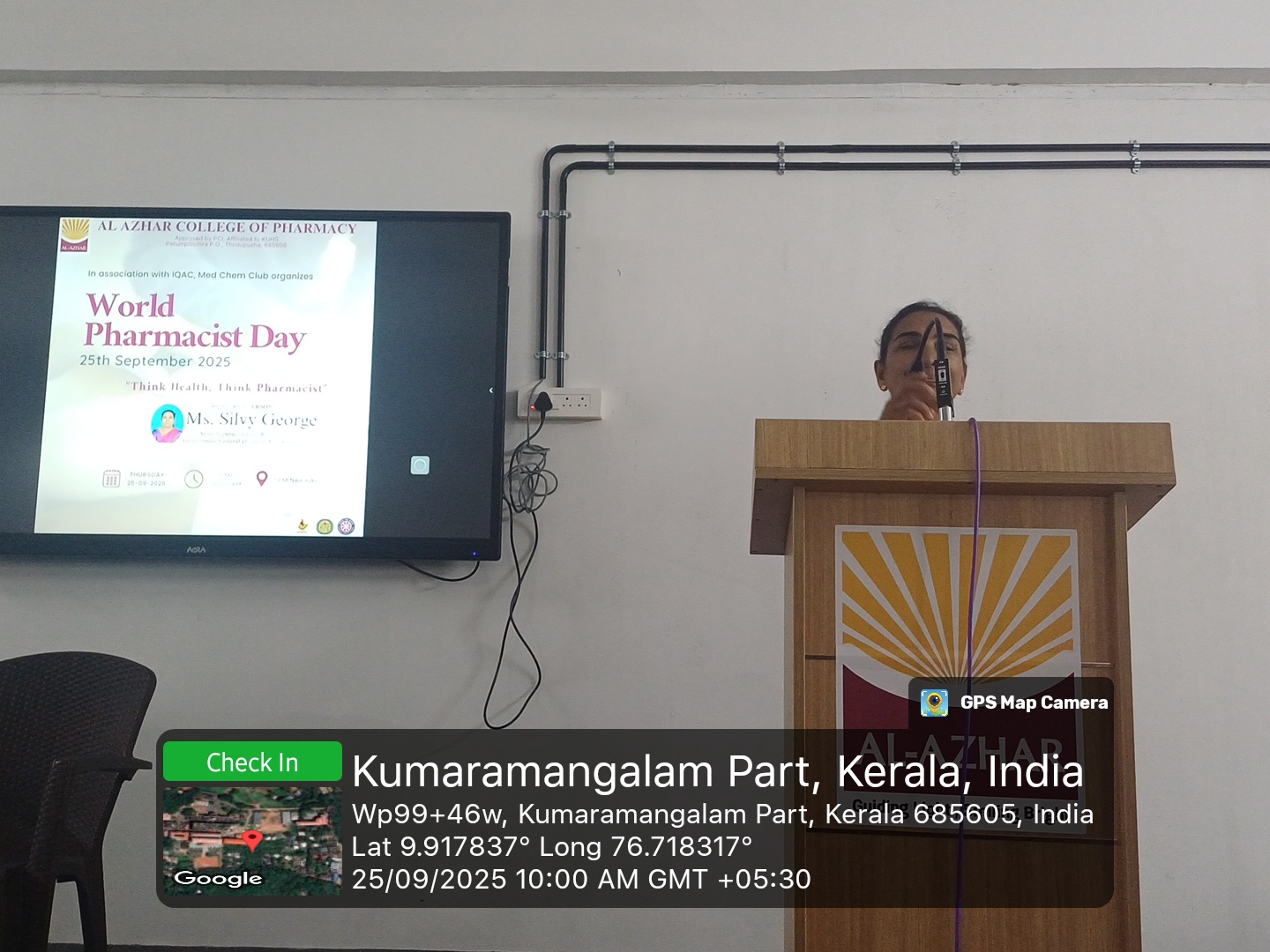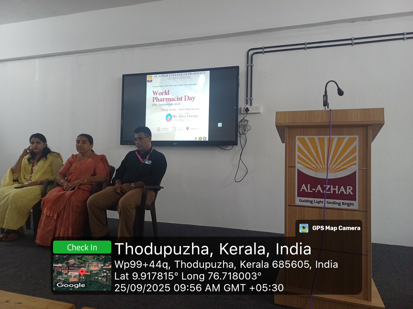 The World Pharmacist Day 2025 celebration was held at 10:00 AM in the Seminar Hall of Al Azhar College of Pharmacy, organized by IQAC in association with the MedChem Club, focusing on the global theme “Think Health, Think Pharmacist.” The programme featured Ms. Silvy George, Store Superintendent (Retired), Government General Hospital, Ernakulam, as the resource person, who highlighted the indispensable role of pharmacists in strengthening healthcare systems and ensuring patient well-being. The event commenced with a warm welcome address by Dr. Shyam Kumar B., Principal, and concluded with a vote of thanks delivered by Dr. Sari S. Nair, Vice Principal. The session effectively emphasized the evolving responsibilities of pharmacists and inspired students to uphold professionalism, compassion, and excellence in pharmacy practice.