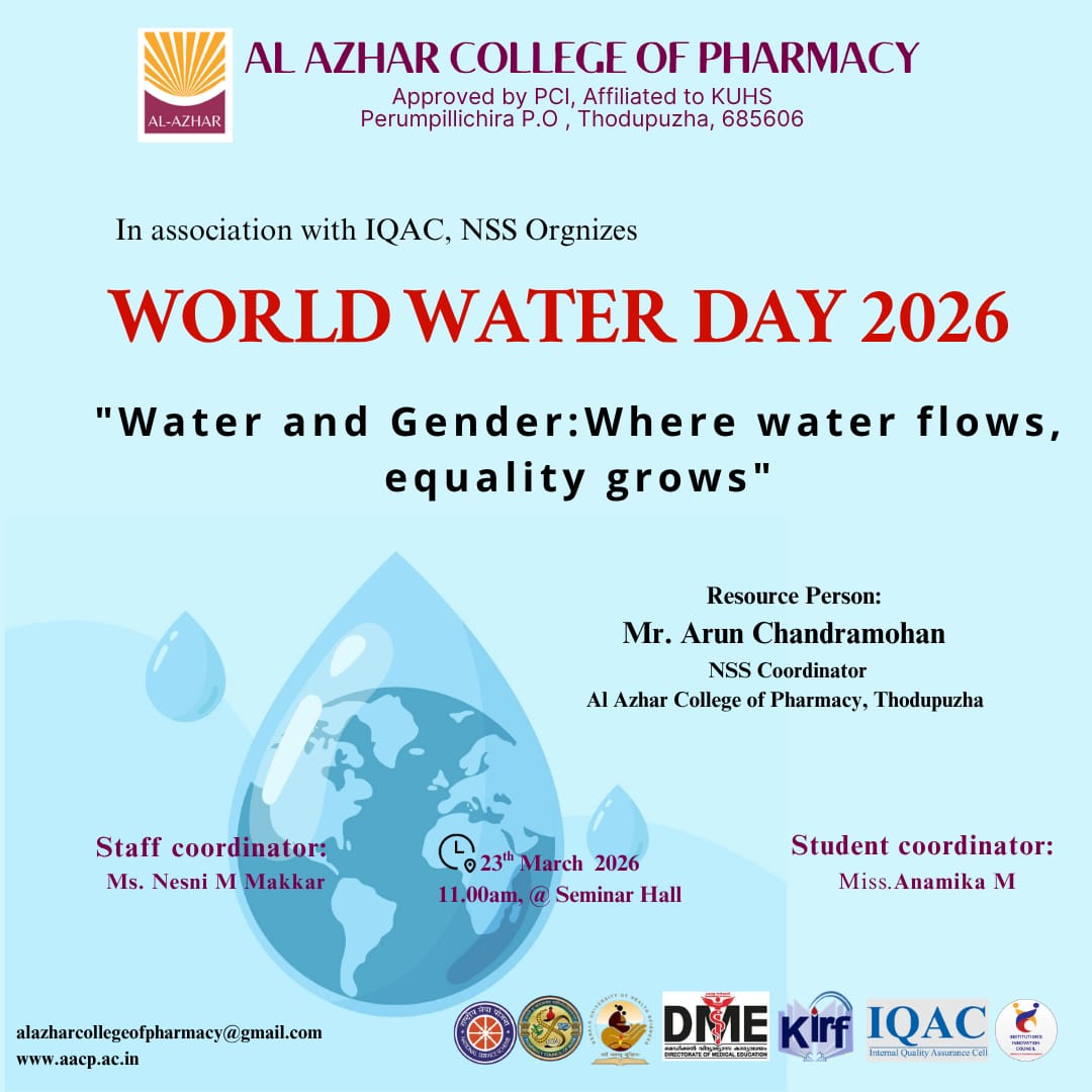 Al Azhar college of pharmacy in association with IQAC and NSS organized World Water Day on theme " Water and Gender, where water flows equally grows. an awareness class was organized in this regard. Resource person was Mr. Arun Chandramohan, Assistant Professor, Department of Pharmacy practice