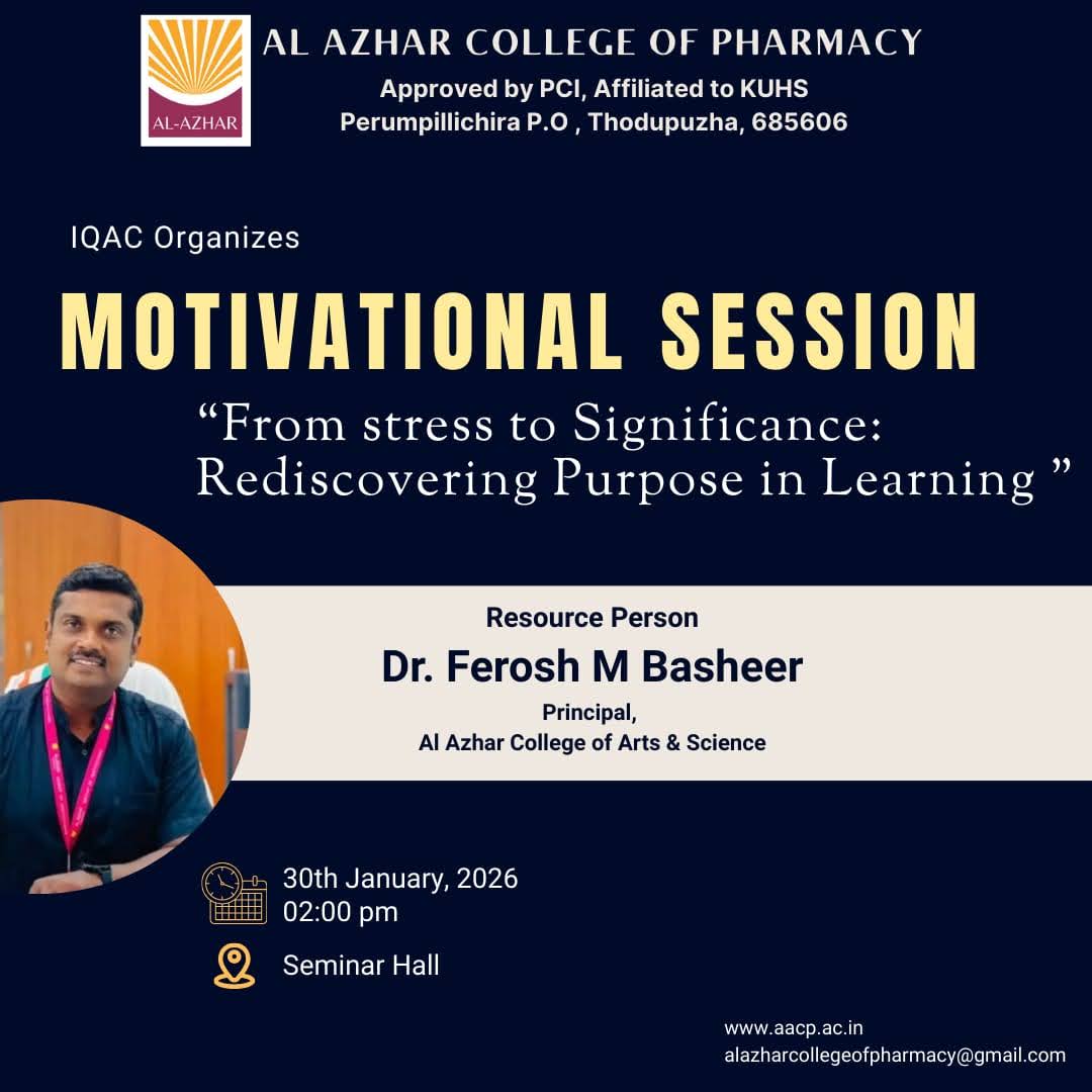 In association with IQAC ,organized a motivational session on the topic "From stress to significance : rediscovering purpose in learning" by Dr. Ferosh M Basheer, Principal, Al Azhar College of Arts and ScienceDr. Ferosh Talking session