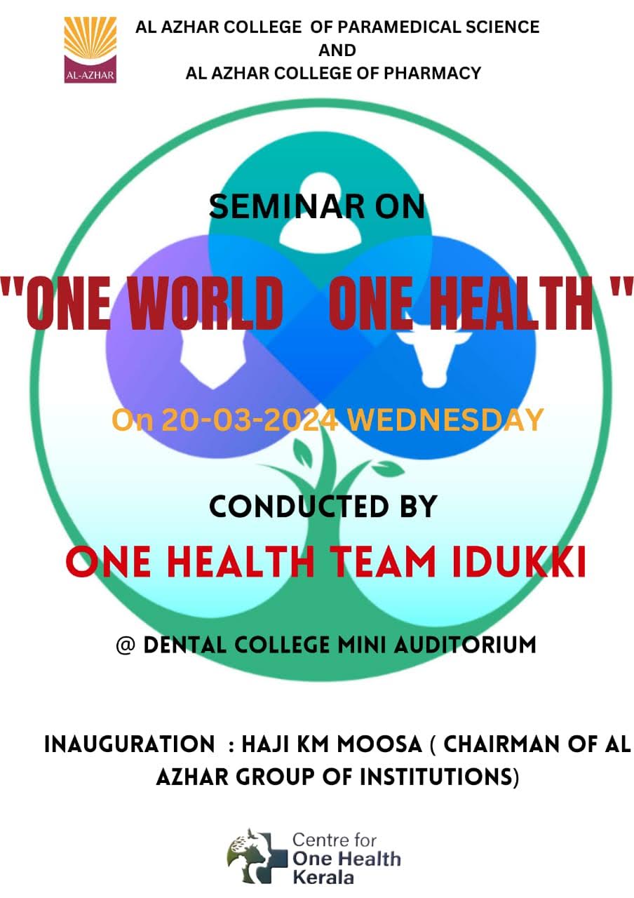One world one health” was a seminar arranged by Al azhar college of pharmacy and Al azhar college of paramedical science in association with centre for one health Kerala. And it was conducted by one health team Idukki. Sri. Anil kumar R and Sri. Peter C , district mentors of one health ,were the speakers.