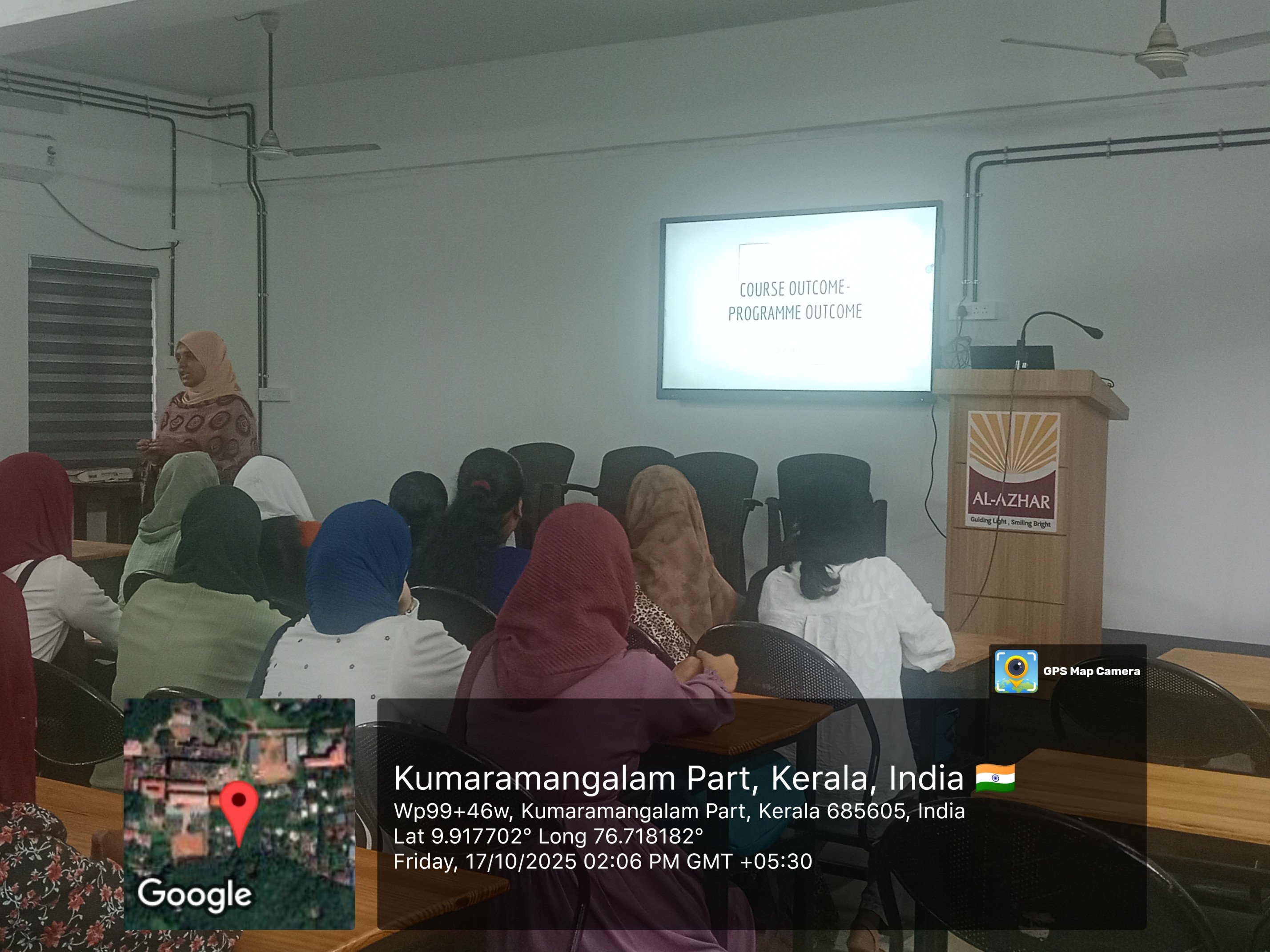 The COPO Sensitization Class for the First Semester B. Pharm 2025 Batch was conducted on 17 October 2025 at 2:00 PM, led by Ms. Nesni M. Makkar, Associate Professor, Department of Pharmacology, at Al Azhar College of Pharmacy. The session provided students with a clear understanding of the Course Outcomes (COs) and Program Outcomes (POs) framework, emphasizing its significance in outcome-based education and academic planning. The programme helped students familiarize themselves with the expectations of the curriculum and the importance of aligning learning with measurable outcomes, ensuring a strong academic foundation from the very beginning of their course.