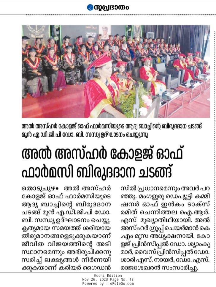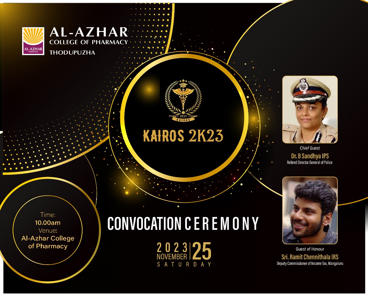 FIRST CONVOCATION CEREMONY OF AL AZHAR COLLEGE OF PHARMACY, "Dr. B. Sandhya, IPS, gave the inaugural speech during the Convocation Attachments brochure 1 Kairos.jpg (268.7 KB) IMG-20231126-WA0003.jpg (133.22 KB) Date Sat, 11/25/2023 - 12:00 Department Pharmaceutical Chemistry Duration 1 day