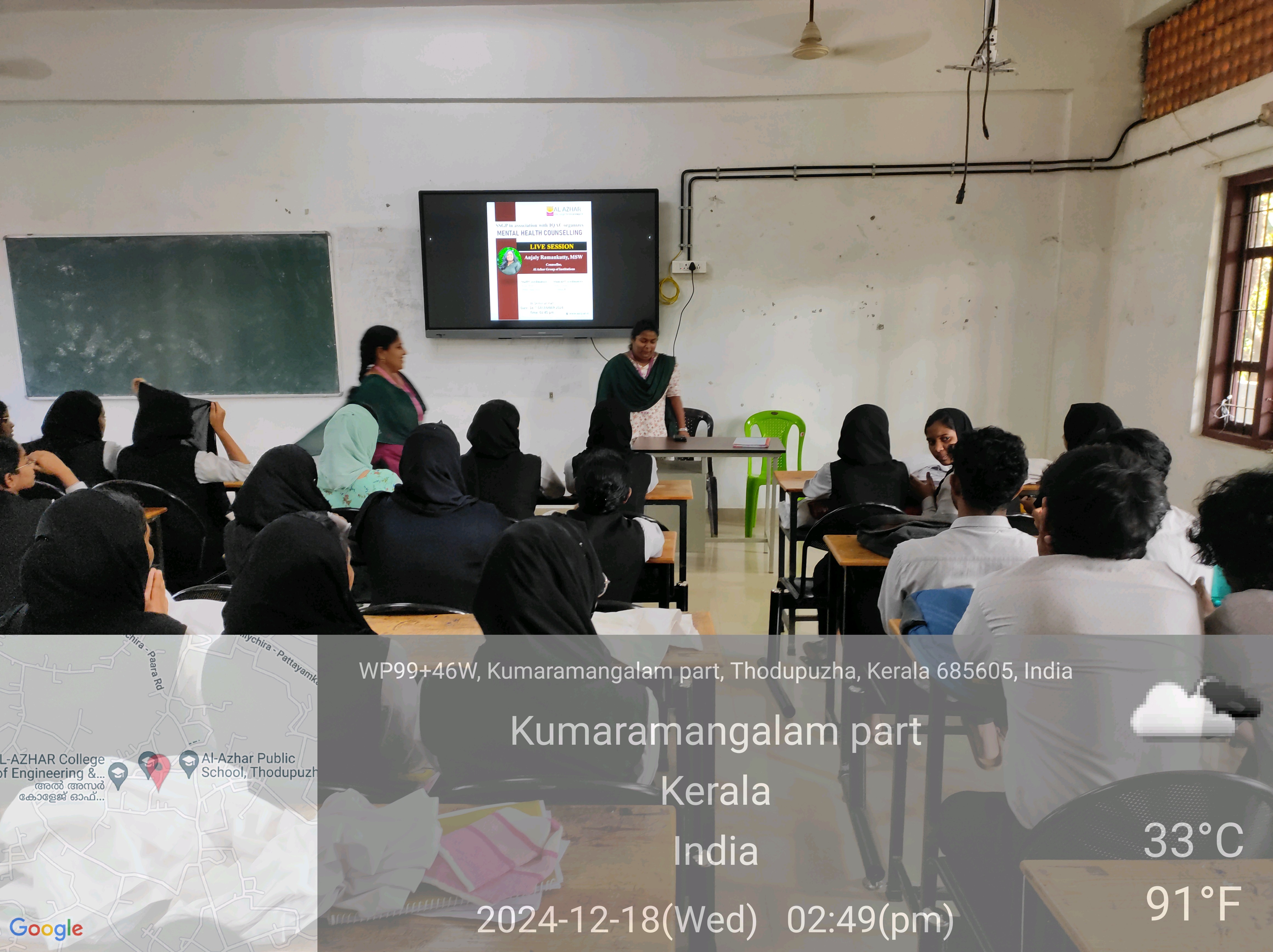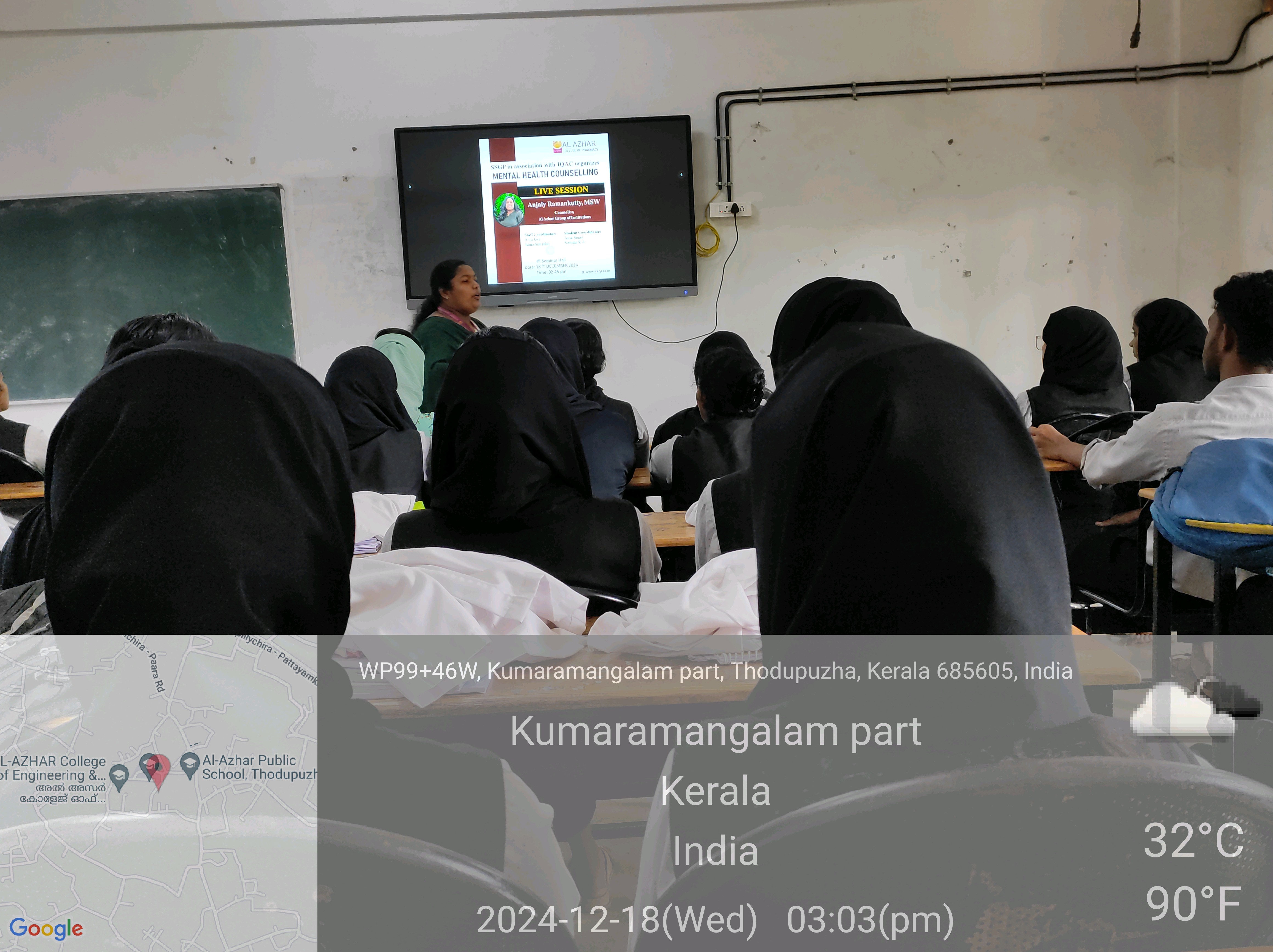 A Mental Health Counseling session was conducted at Al Azhar College of Pharmacy on December 18, 2024, organized by SSGP in association with the IQAC. The session featured Anjaly Ramankutty, MSW, Counselor at Al Azhar Group of Institutions, as the speaker. She provided valuable insights on mental health, offering guidance on coping strategies and the importance of emotional well-being for students and staff.
