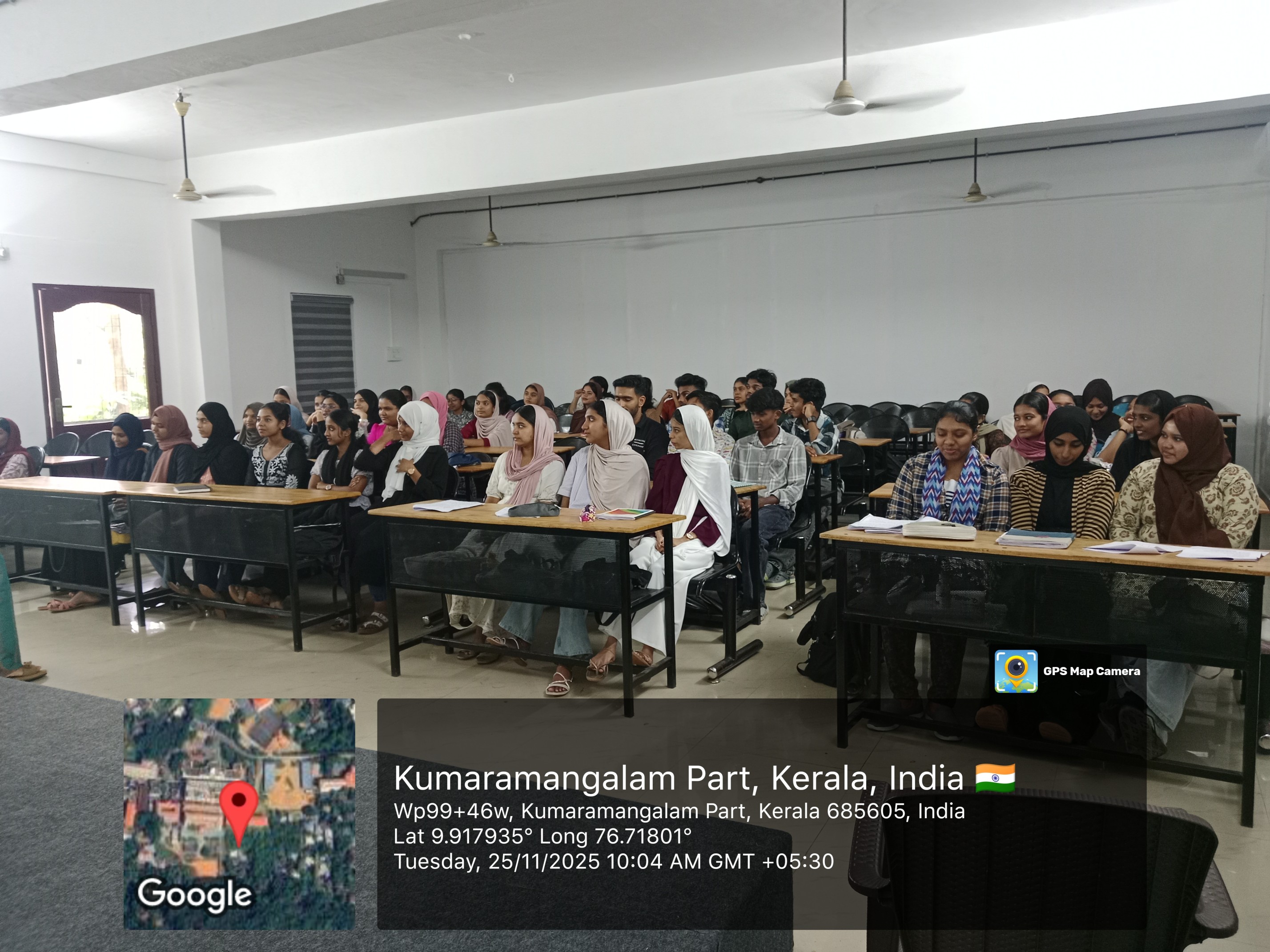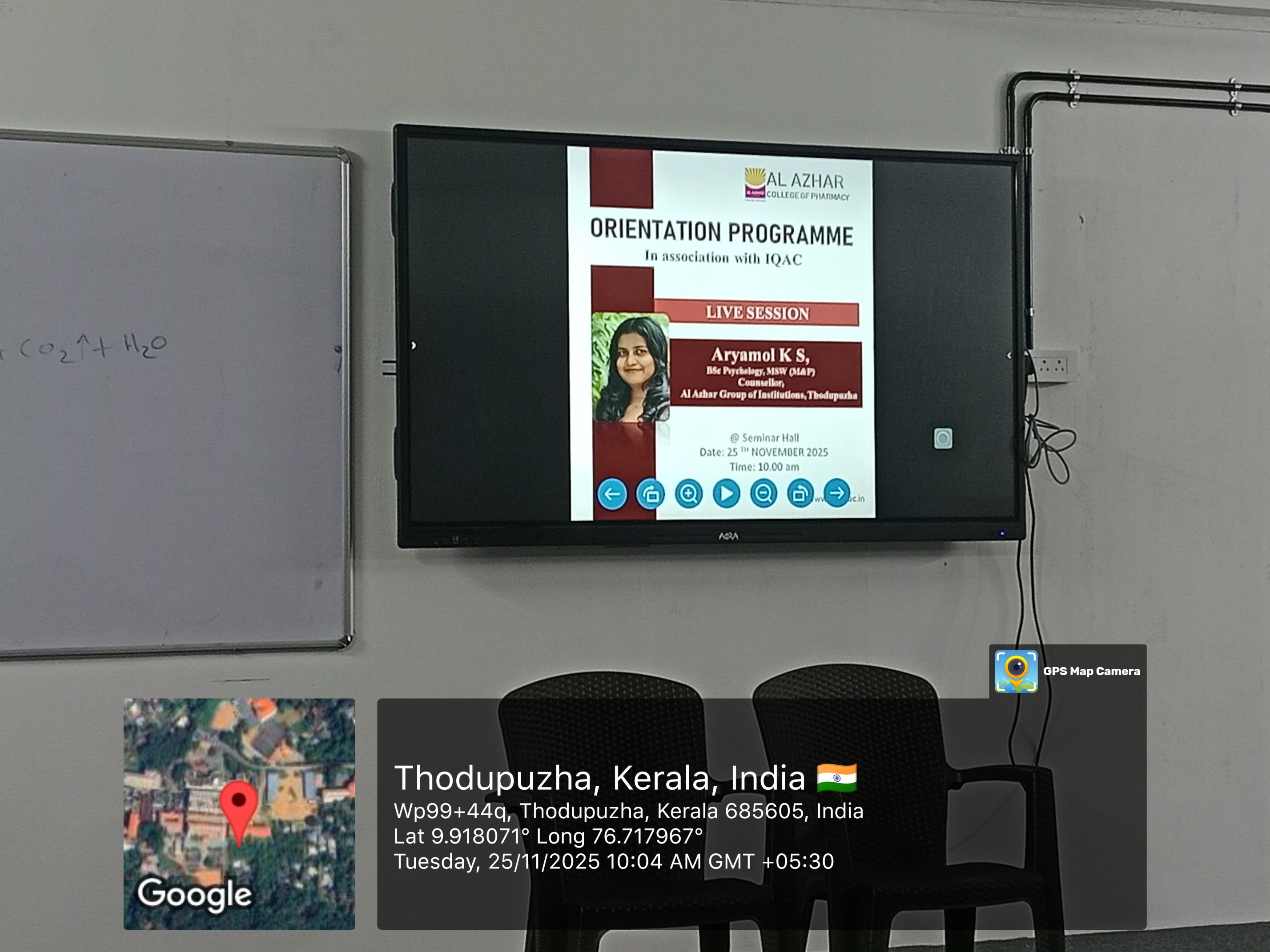 An Orientation Programme on Mental Health was conducted on 25th November 2025 at 10:00 am in the seminar hall of Al Azhar College of Pharmacy for the first semester B. Pharm students, organized by IQAC. The session was led by Ms. Arya Mol K.S, Counsellor from Al Azhar Group of Institutions, who discussed the importance of mental well-being, stress management, emotional balance and seeking timely support.