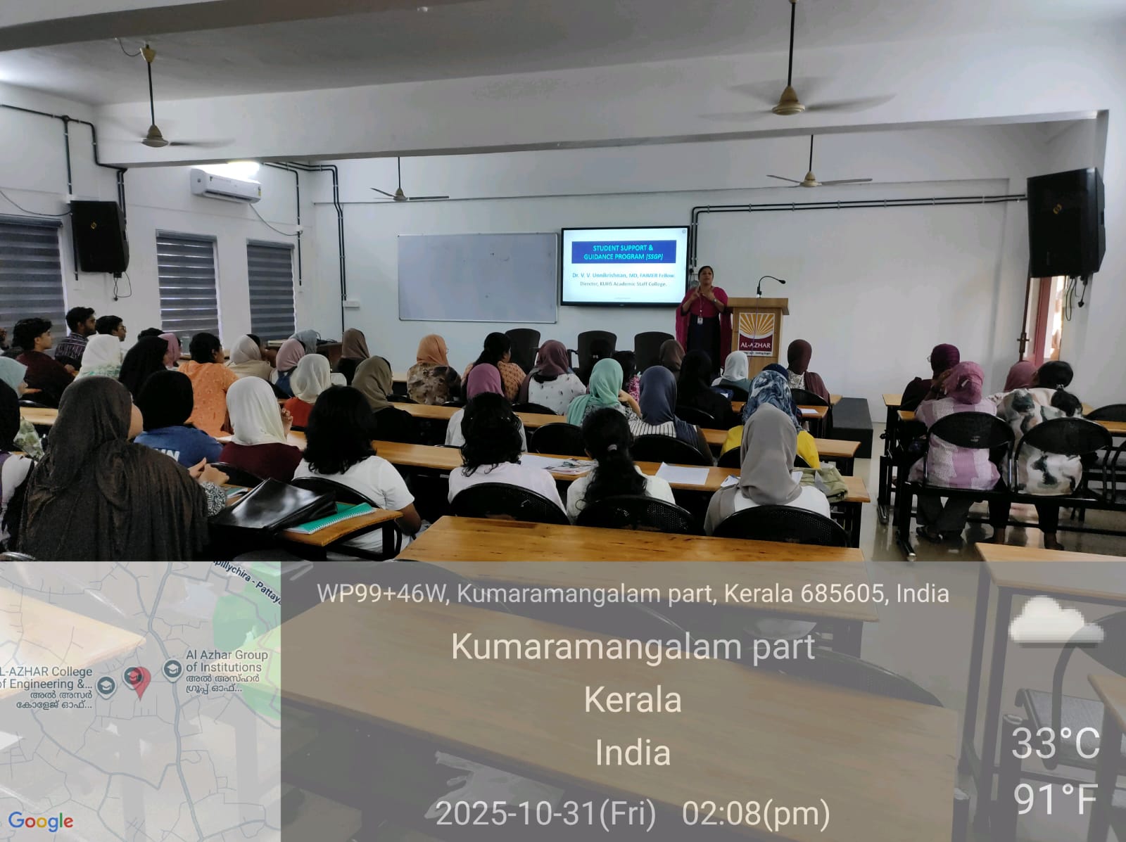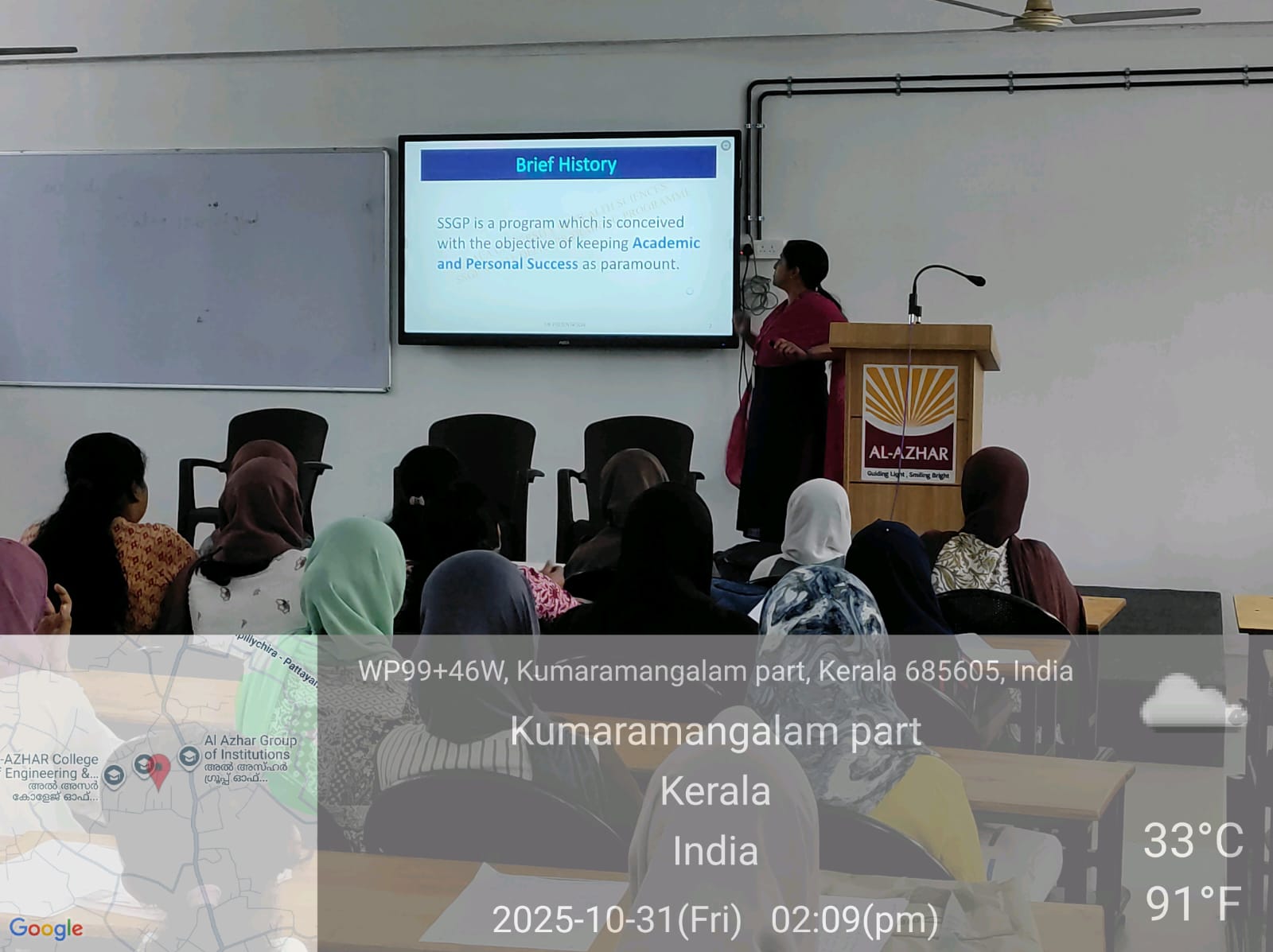 The Student Support & Guidance Programme Orientation for the First Semester B. Pharm 2025 Batch was conducted on 31 October 2025 at Al Azhar College of Pharmacy, organized by IQAC in association with SSGP. The session was led by Ms. Jeena Ann John, SSGP Nodal Officer and Associate Professor, who guided the students on the various academic, personal, and career support services available to them. The orientation helped students understand the role of the SSGP in facilitating mentorship, counseling, and holistic development, thereby equipping them to make the most of the resources and guidance offered throughout their academic journey.