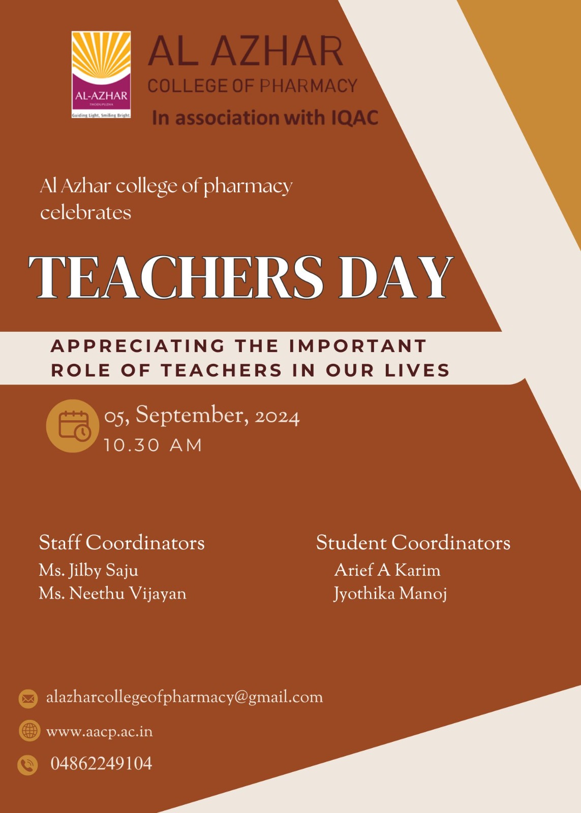 Al Azhar College of Pharmacy celebrated Teachers' Day on September 5th, 2024, with great enthusiasm, an event organized by the 4th semester B.Pharm students. The program was filled with vibrant activities, including fun games, heartfelt greetings for teachers, and cultural performances by the students. The highlight of the event was when teachers shared their experiences and fond memories with the students, creating a warm and engaging atmosphere. The celebration fostered a deeper bond between students and teachers, making it a memorable occasion for all.