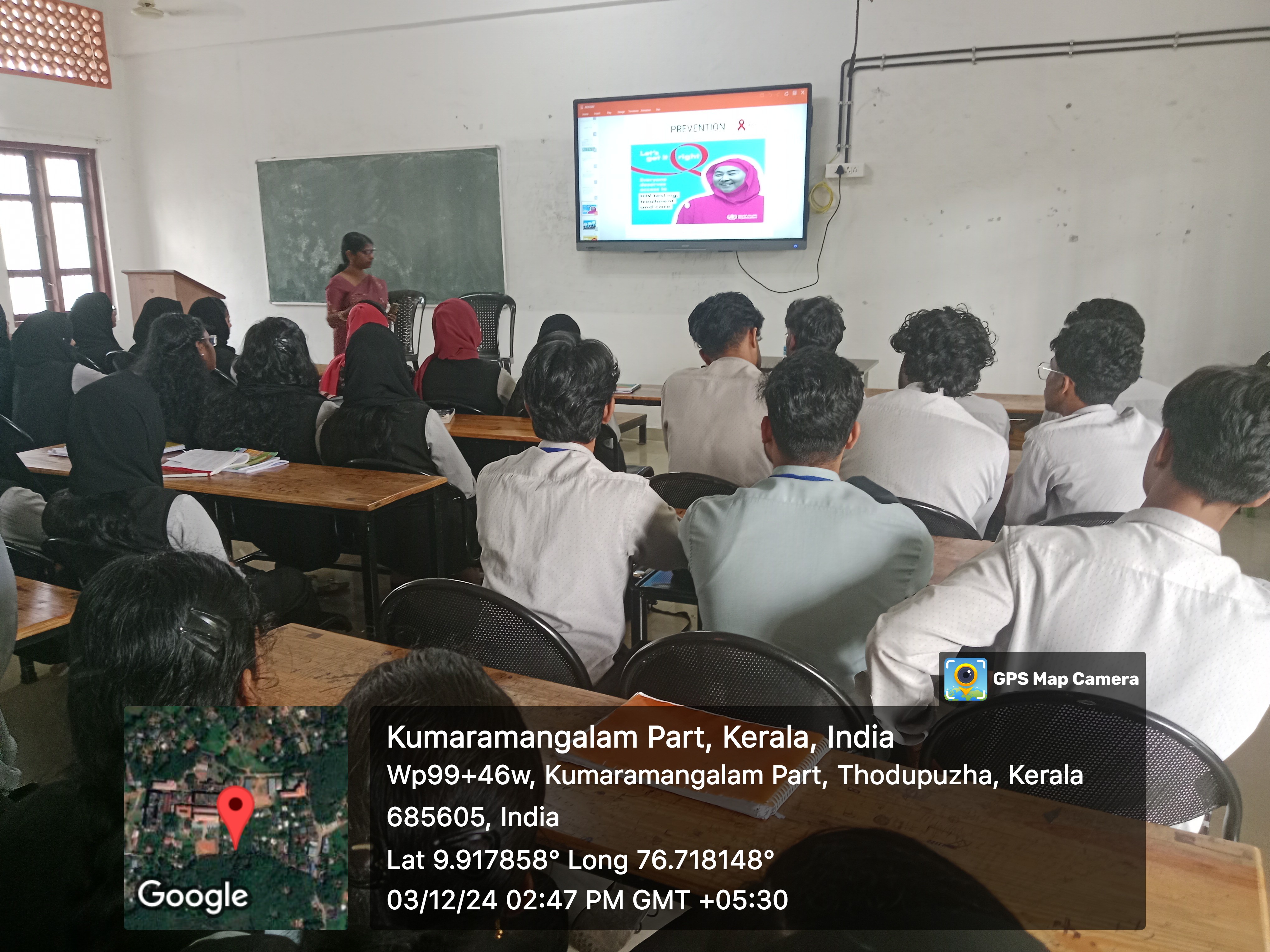 World AIDS Day was observed at Al Azhar College of Pharmacy on December 3, 2024, with the theme "Take the Right Path, My Health My Right." The event featured Ms. Praveena Prakash M, Principal of Al Azhar College of Nursing, as the speaker. She addressed the importance of HIV/AIDS awareness, emphasizing the right to health and the significance of making informed choices for personal well-being.